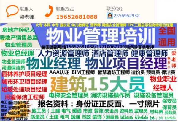 全国物业管理三证:物业经理,项目经理,带金牌的高级物业职业经理人报名,房地产行业证书:房地产经纪人,房地产销售总监,房地产销售人员,房地产规划师,房地产营销师等报名咨询梁老师